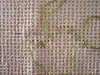 Continue to work the first (bottom) row of the pattern across to the left side of the towel, repeating the same pattern across. Do not cut the floss end.