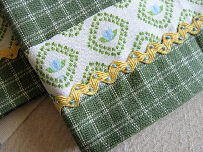 I finished off these hand towels yesterday. It was a simple thing to sew a fabric strip down and trim it with rick rack. Easy peasy! I will admit the embroidered french knots took a bit of time, but, as I was listening to the news anyway, it was not a hardship.